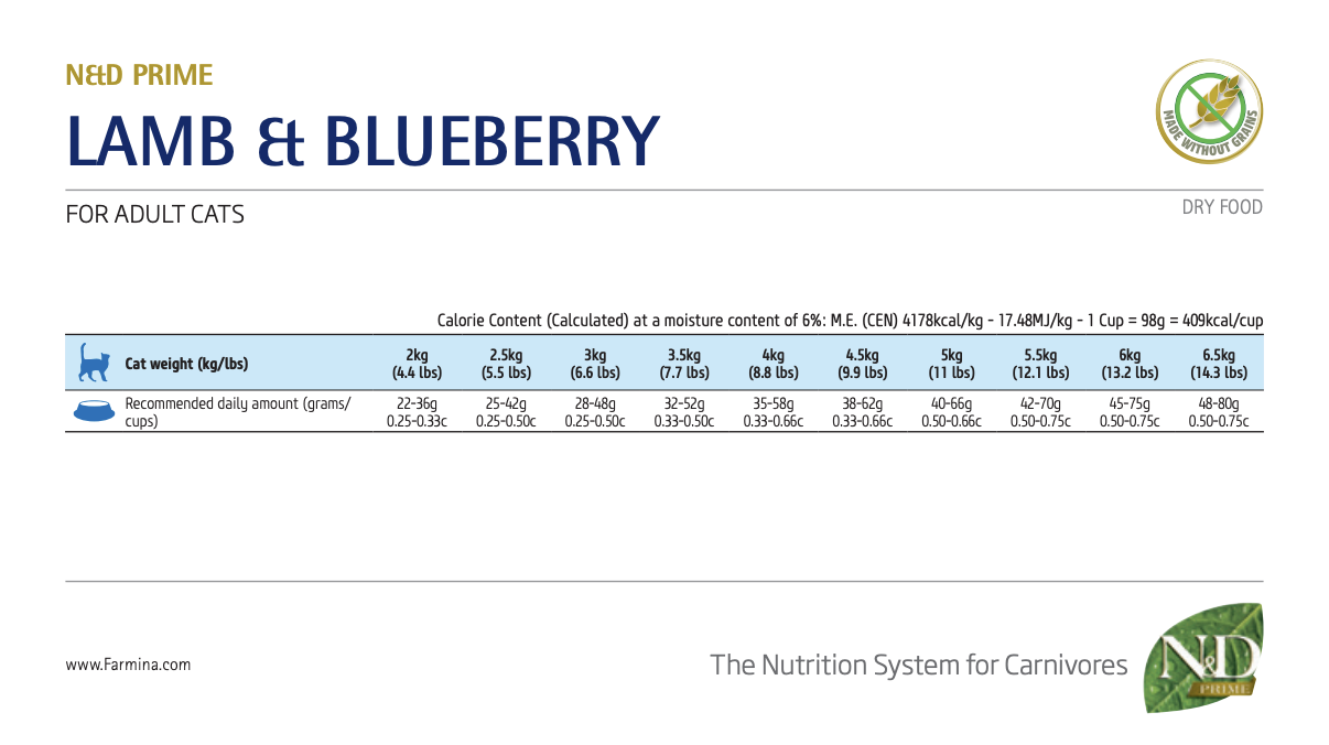 本品可作為12月齡以上成貓之主食。以紐西蘭羊肉新鮮肉塊製成,完全不添加肉粉,不使用人工添加物。並添加各式新鮮蔬果,其中藍莓更是擁有多種保健效果,為貓咪絕佳的保健天然糧。