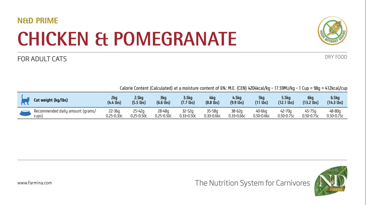本品可作為12月齡以上成貓之主食。以義大利放山土雞新鮮肉塊製成,完全不添加肉粉,不使用人工添加物。並添加各式新鮮蔬果,其中石榴更是被稱為抗氧化之王,為貓咪絕佳的保健天然糧。