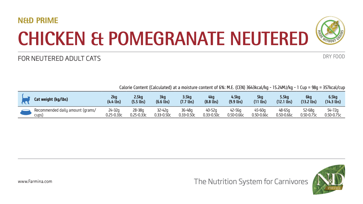 本品可作為12月齡以上成貓之主食。低卡路里配方,以義大利放山土雞新鮮肉塊製成,完全不添加肉粉,不使用人工添加物。並添加各式新鮮蔬果,其中石榴更是被稱為抗氧化之王,為貓咪絕佳的保健天然糧。